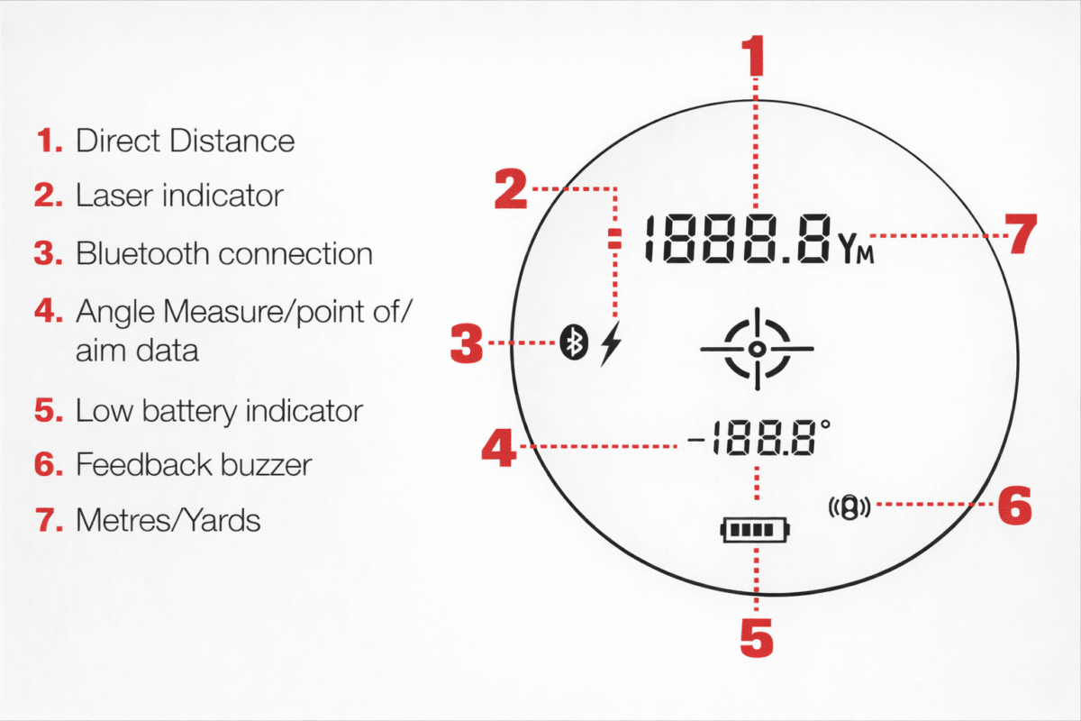 - LCD display has a choice of 3 reticle types and shows distance/POA settings